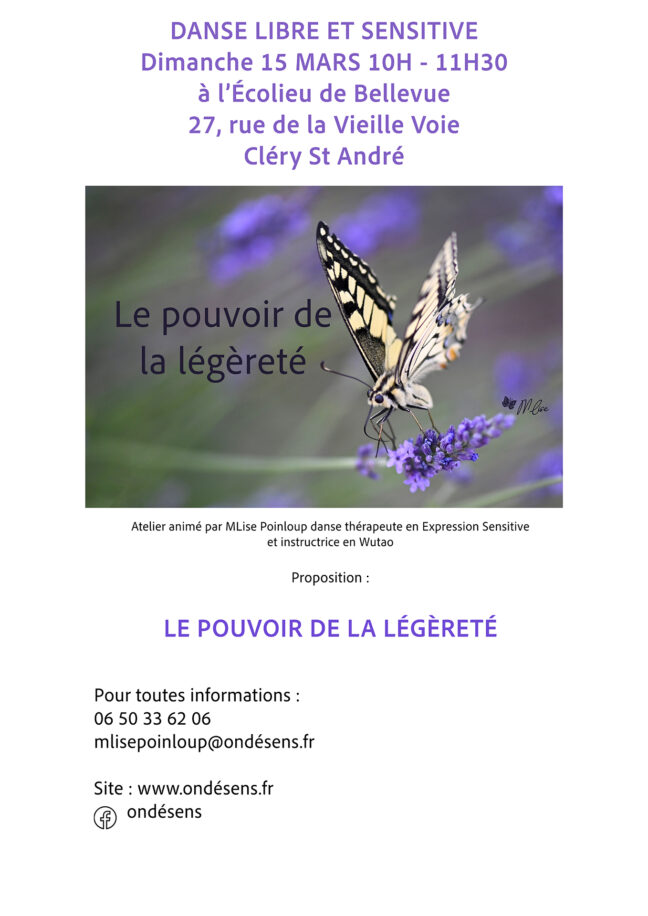 Le dimanche 15 mars de 10h à 11h30 j’animerai un nouvel atelier de Danse Libre et Sensitive  » Le pouvoir de la légèreté  » à  l’Ecolieu de Bellevue 27 rue de la Vieille Voie Cléry-Saint-André