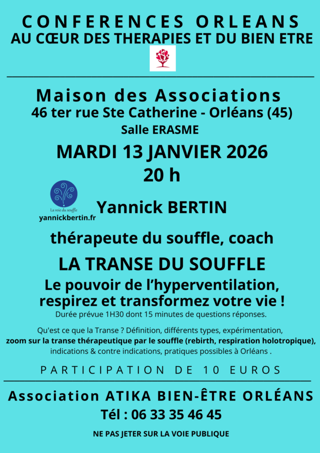 Ajoutez à votre agenda 01/13/2026 8:00pm 01/13/2026 8:00 Europe/Paris LA TRANSE DU SOUFFLE Le pouvoir de l’hyperventilation, respirez et transformez votre vie ! ZOmm sur la respiration holotropique cf le flyer