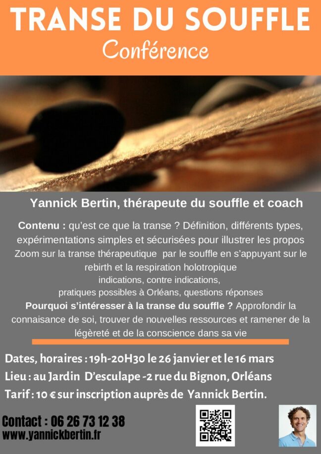 Ajoutez à votre agenda 01/26/2026 8:30pm 01/26/2026 8:30 Europe/Paris TRANSE DU SOUFFLE Le pouvoir de l’hyperventilation, zoom sur la respiration holotropique   cf flyer